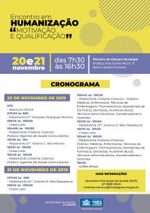 Alunos e Docentes do PPGENF do CPTL participaram do encontro na Câmara Municipal de Três Lagoas do tema Humanização – Motivação e Qualificação. O encontro ocorreu nos dia 20 e 22/11 com os profissionais da Rede de Atenção Primária de Saúde e das Clínicas Especializadas da Secretaria Municipal de Saúde (SMS) de Três Lagoas. Detalhe da programação pode ser conferida abaixo.