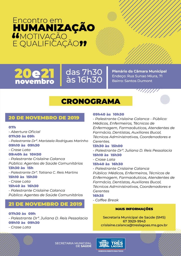 Alunos e Docentes do PPGENF do CPTL participaram do encontro na Câmara Municipal de Três Lagoas do tema Humanização – Motivação e Qualificação. O encontro ocorreu nos dia 20 e 22/11 com os profissionais da Rede de Atenção Primária de Saúde e das Clínicas Especializadas da Secretaria Municipal de Saúde (SMS) de Três Lagoas. Detalhe da programação pode ser conferida abaixo.