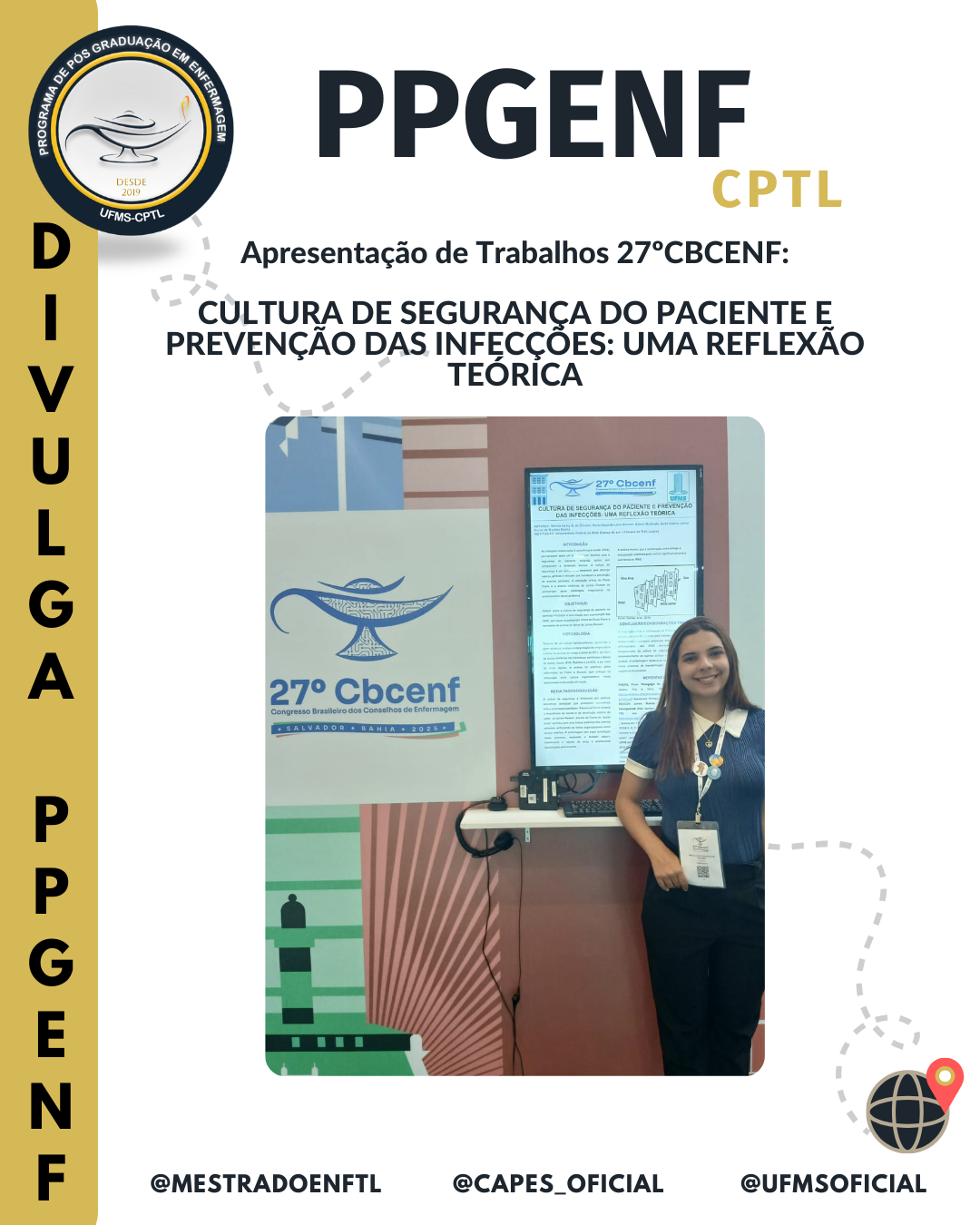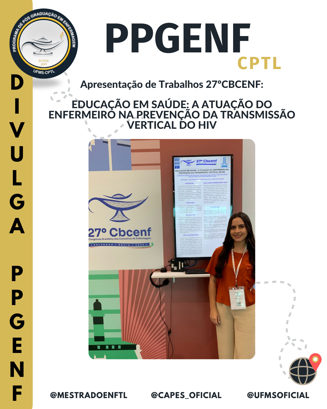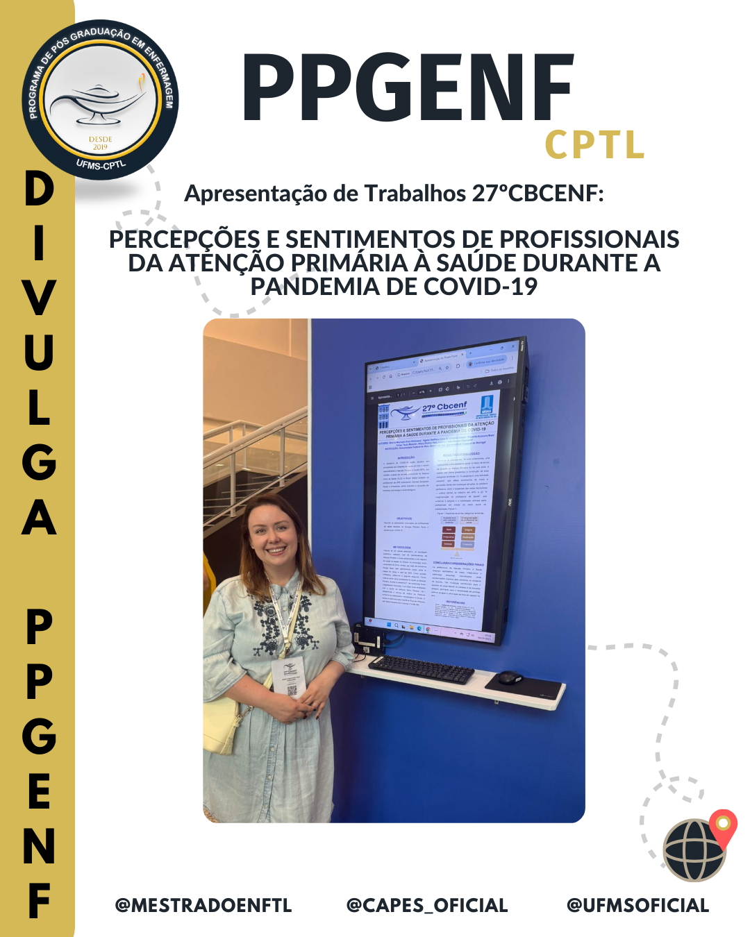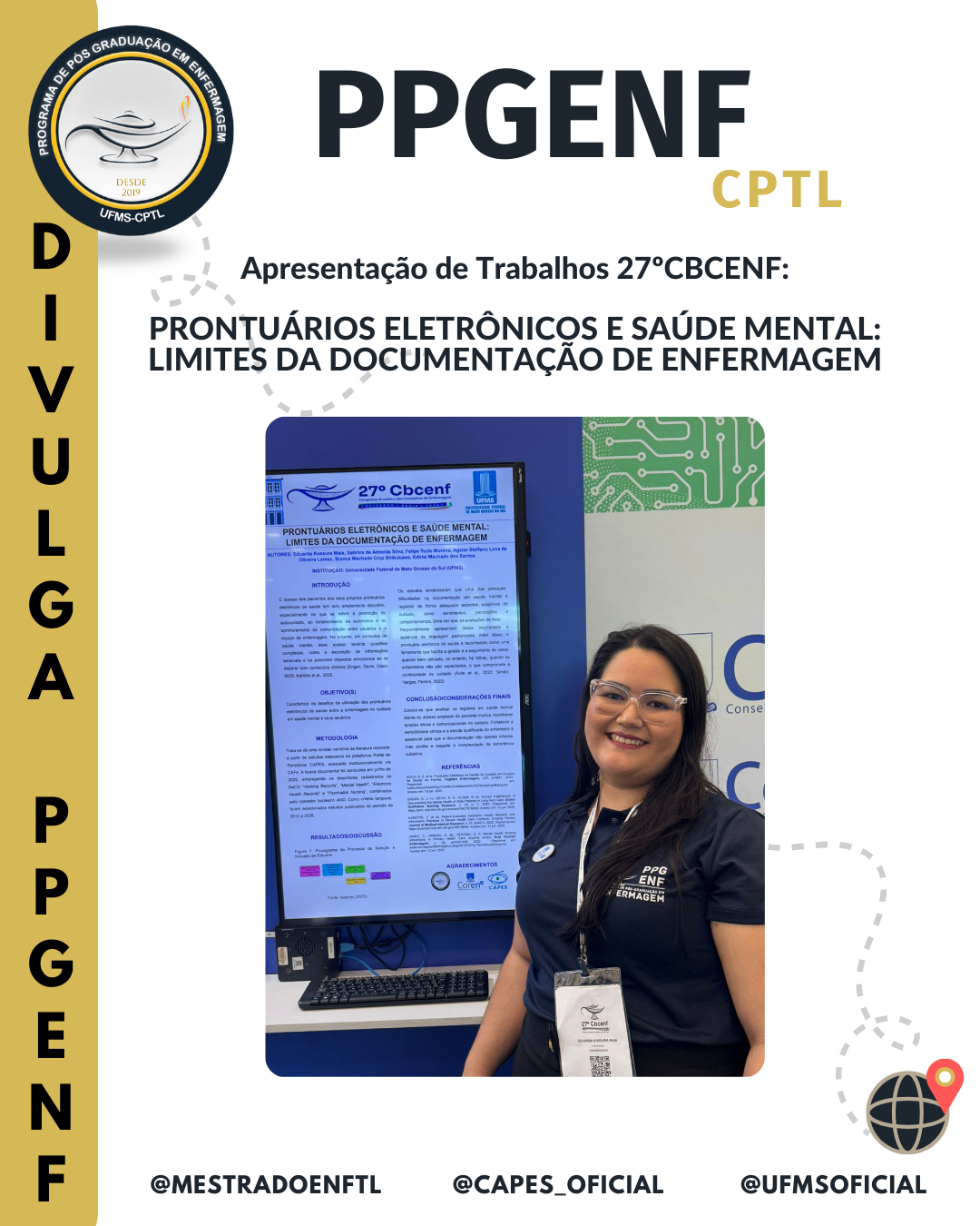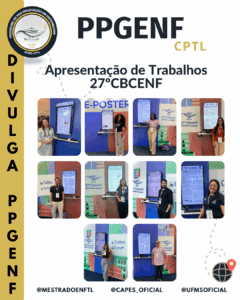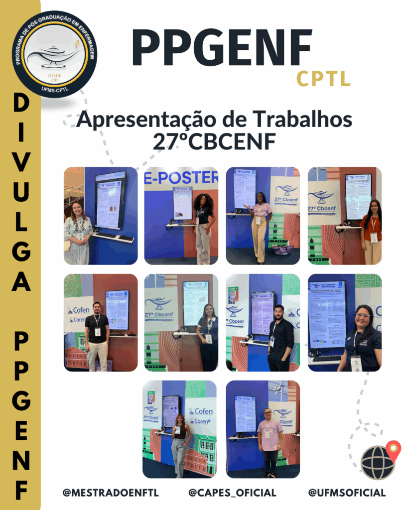 Os discentes do Mestrado em Enfermagem (PPGEnf/UFMS/CPTL) Agster, Beatriz, Cesar, Eduarda Kussura, Eduarda Leite, Felipe, Hilary, Hotência e Wínola, juntamente com a docente Profa. Dra. Bianca Chibukawa, tiveram trabalhos aprovados e apresentados na modalidade e-pôster neste importante evento científico.
