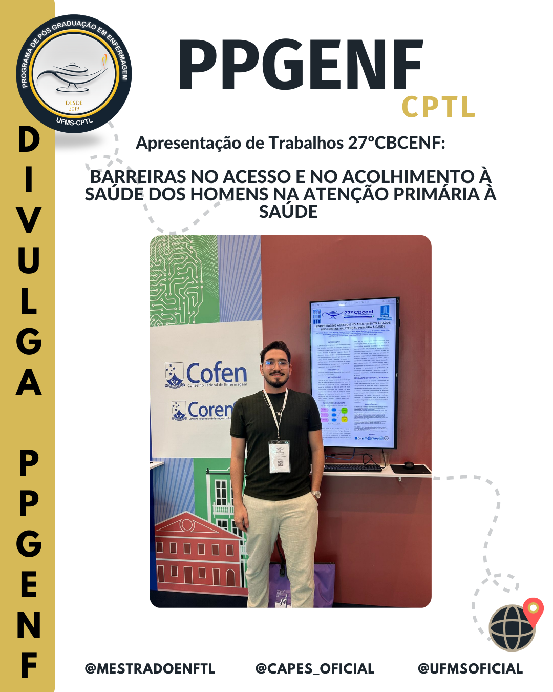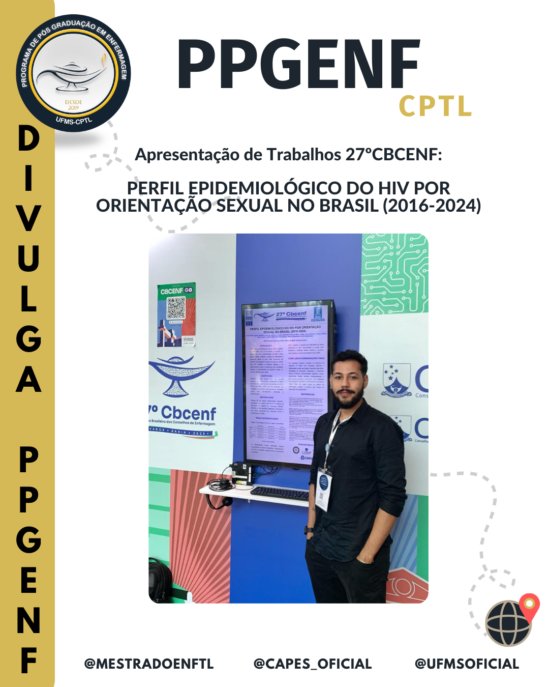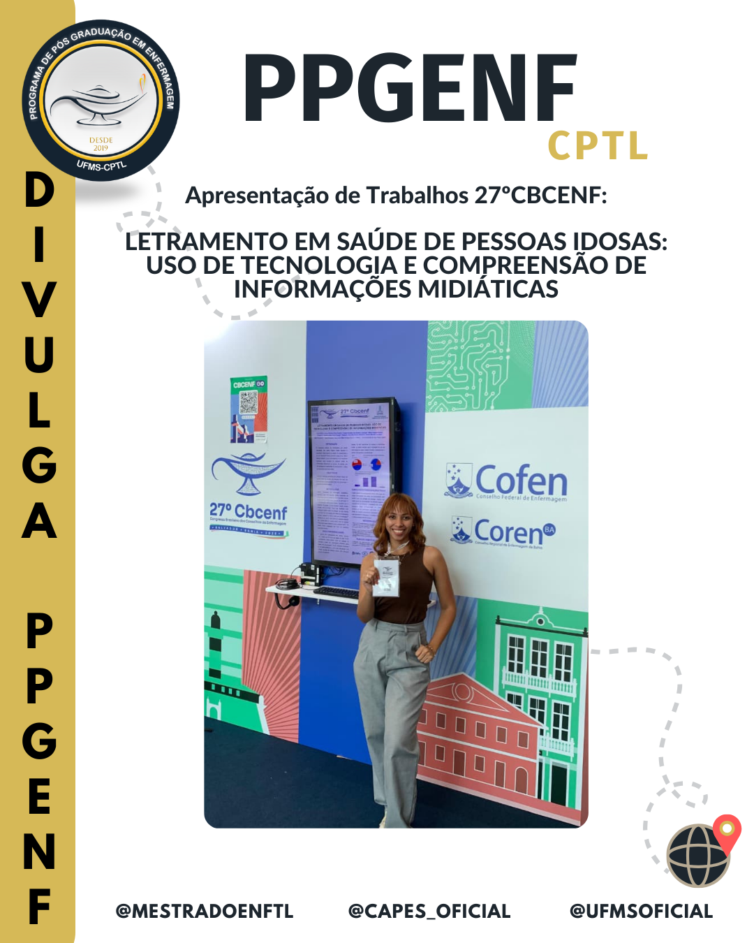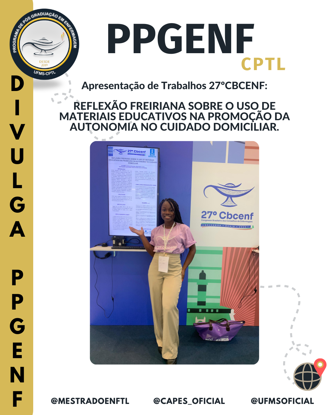 Os discentes do Mestrado em Enfermagem (PPGEnf/UFMS/CPTL) Agster, Beatriz, Cesar, Eduarda Kussura, Eduarda Leite, Felipe, Hilary, Hotência e Wínola, juntamente com a docente Profa. Dra. Bianca Chibukawa, tiveram trabalhos aprovados e apresentados na modalidade e-pôster neste importante evento científico.